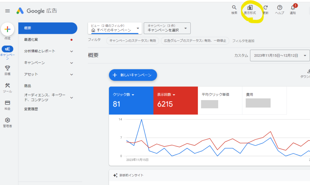 Google広告にログインすると、画面上部に「表示形式」または「新しいデザインのご感想は?」といった表示がある場合があります。