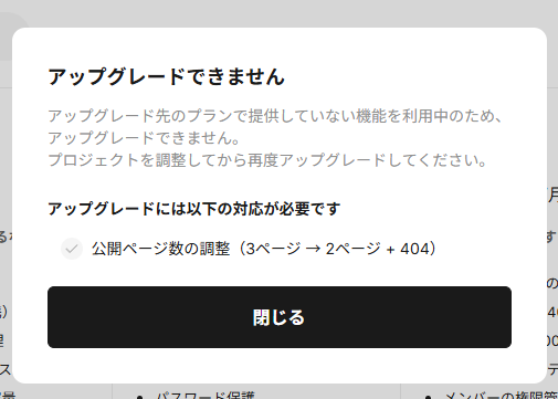 なのに、STUDIO側では「公開ページ:3ページ」と表示され、Miniプランへの変更がブロックされていました。