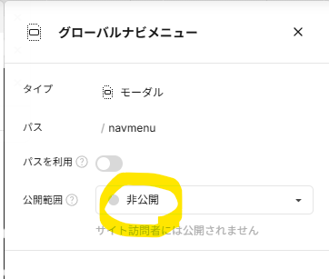 - グローバルナビ(navmenu)が公開ONになっている