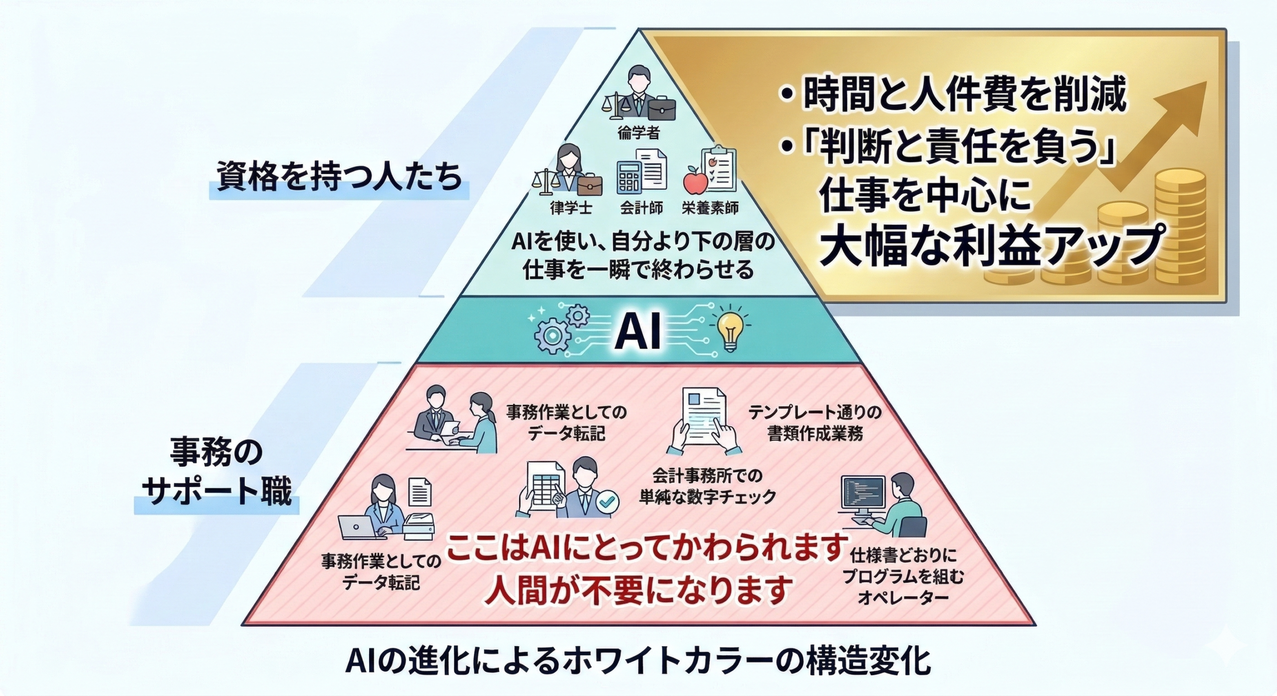 よく「AIにホワイトカラーの仕事が奪われる」と言われますが、現実はもう少し残酷です。