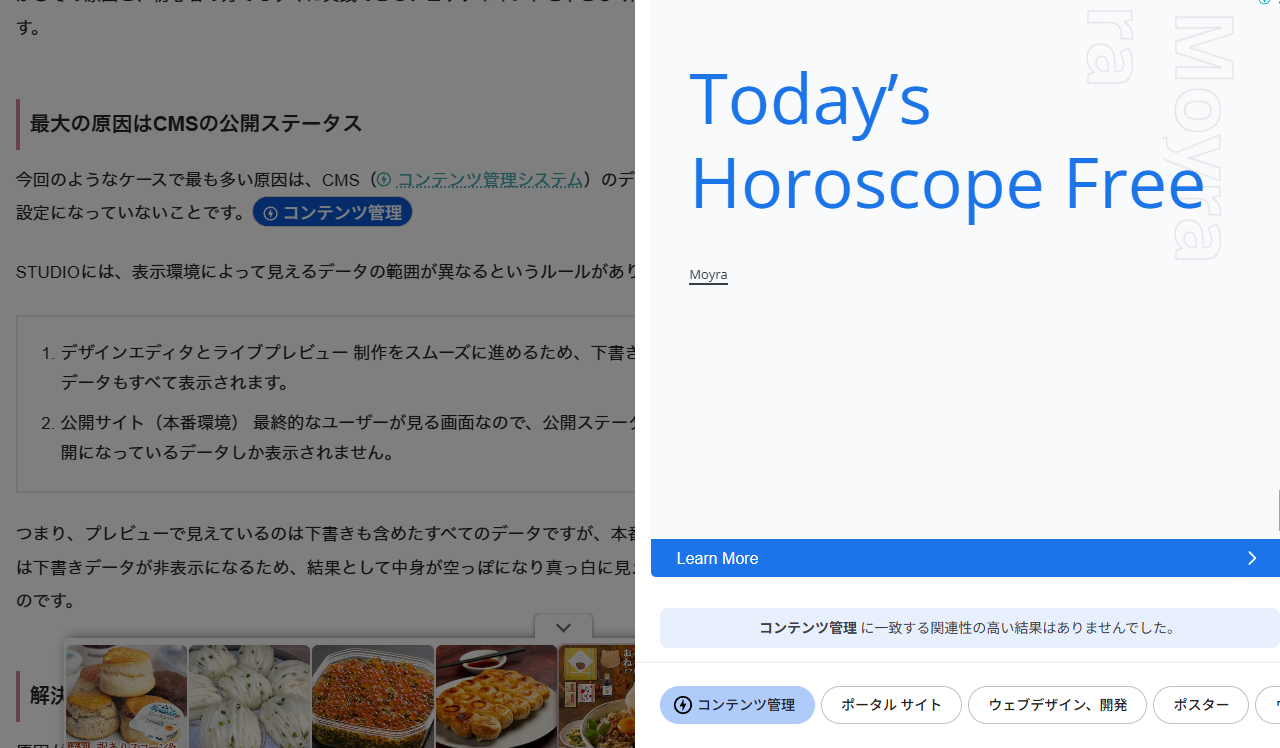 今回、技術的な解説記事の中に「占い」のような、文脈とは無関係なコンテンツが表示されるケースが確認されました。